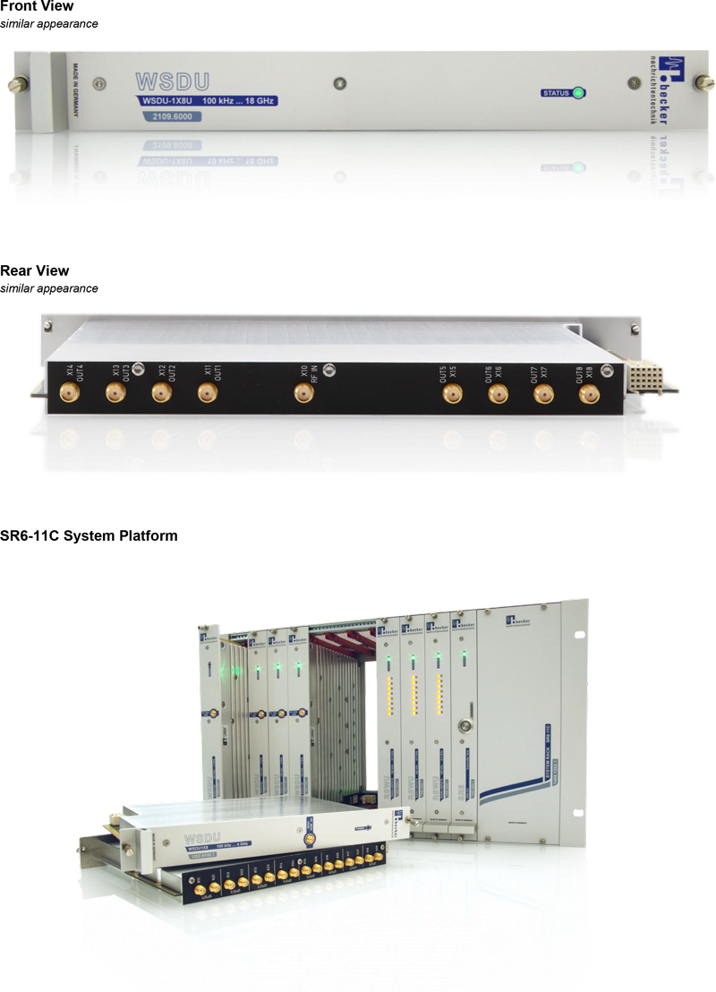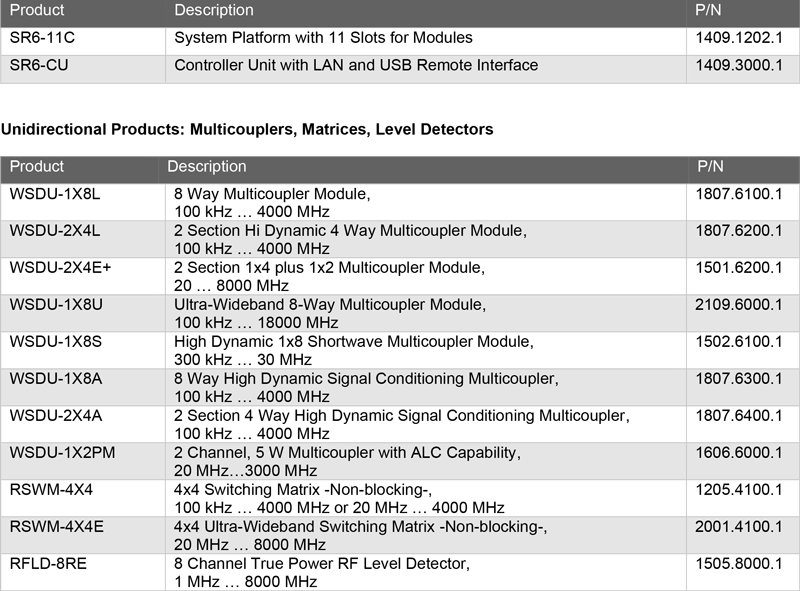 BSDU-2X4A 模組設計為可整合於 SR6-11C 系統平台中,該平台具備 11 個插槽,可搭載 RF 開關、切換矩陣、訊號多工器、可變衰減器(attenuators)、BIAS-T 模組、電平偵測器、雙向訊號處理分波/合路模組與控制器單元;若需模組健康監測功能,則必須搭配 SR6-CU 控制器單元。