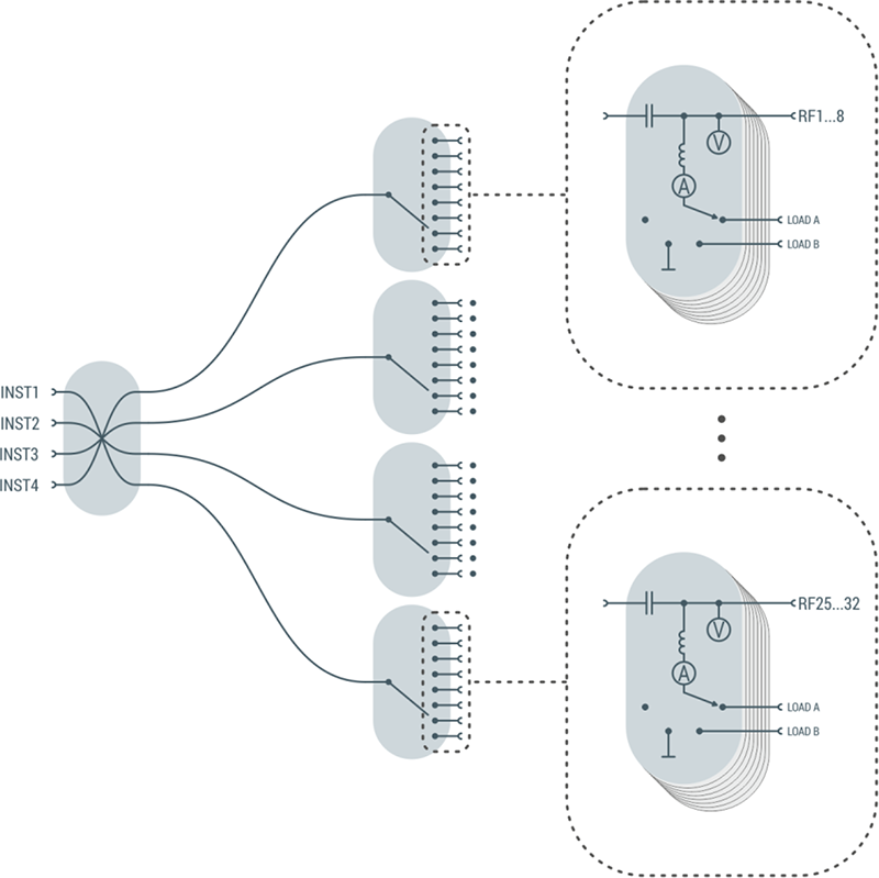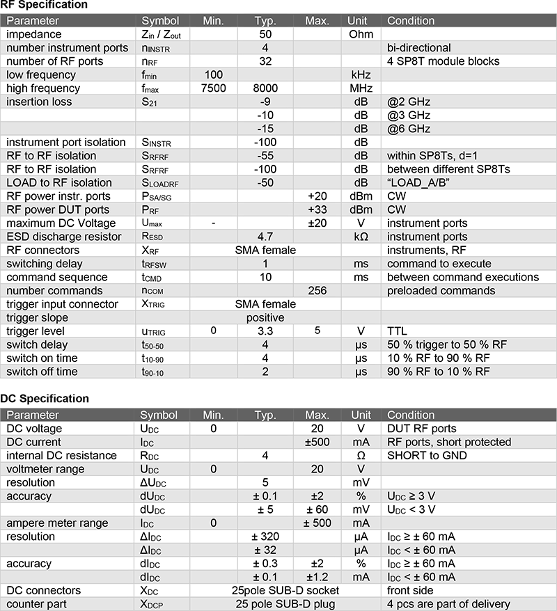 該機種提供 4 組量測儀器埠,可非反射式(non-reflective)地對應切換至 32 組 DUT 埠;若無連接,則會自動匹配至 50 Ω 阻抗;此外,每組 DUT 埠亦配置一組對應之 DC 功能埠,可用於模擬負載或注入虛擬直流電源(phantom DC supply)。
