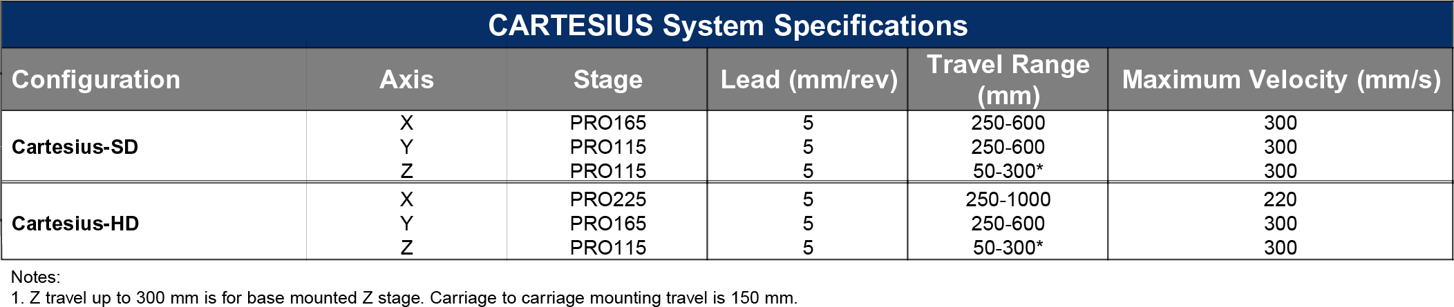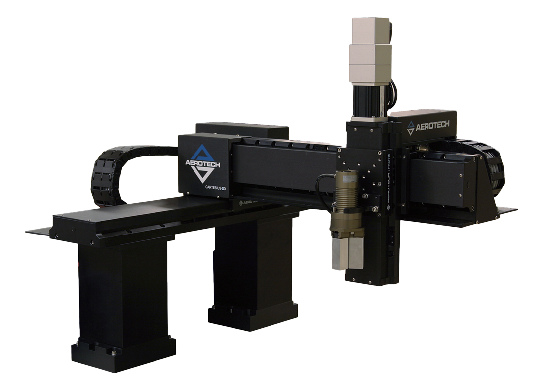 CARTESIUS 採用 Aerotech PRO 系列滑台,包括 PRO115SL、PRO165SL 和 PRO225SL,這些高精度滾珠螺桿滑台搭載無刷伺服電機與編碼器進行位置回饋,並具備硬質外殼與側密封,能有效防止碎屑進入;鋁製外殼經硬化處理,提供耐刮擦的表面,側密封可阻擋灰塵與顆粒,保護軸承與滾珠螺桿,並藉由垂直密封設計輕鬆排除碎屑。