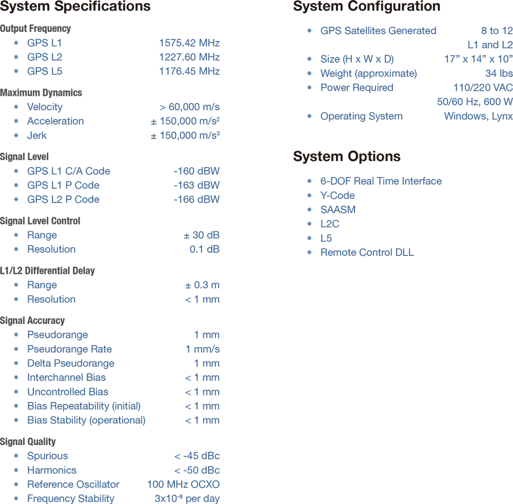 - 最多支援 12 顆 L1 與 L2 頻段之 C/A 碼與 P 碼衛星(SV)模擬