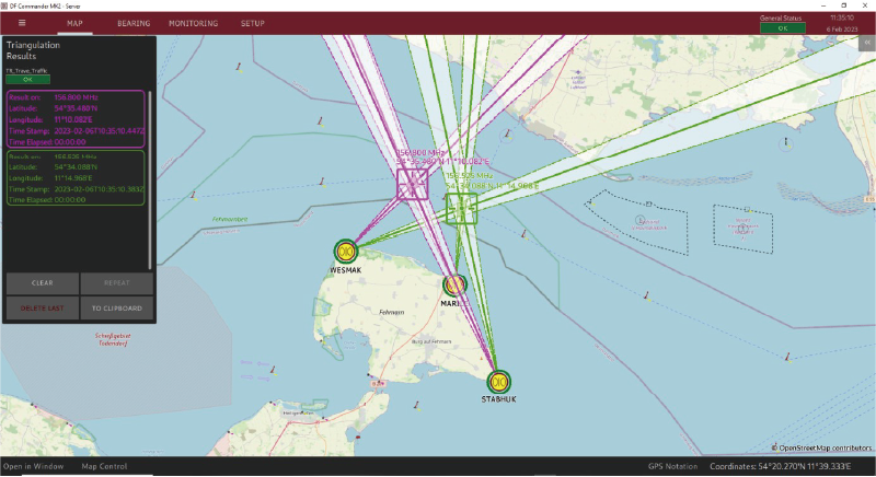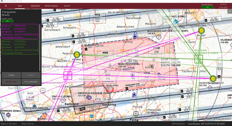 DF Commander MK2 控制與監控軟體可實現對測向儀系統的遠端控制與監控,除了能在各種電子地圖上顯示方位結果(Bearing Results)之外,該控制與監控軟體亦可在不同頻率下計算並顯示交叉測向(Cross Bearings)結果。