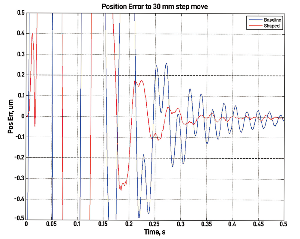 指令整定 (Command Shaping) 功能可有效抑制運動後的殘餘振動,圖中顯示在 30 mm 步進運動後,相較於基準效能(藍線),經過指令整定(紅線)的系統能大幅減少位置誤差的振盪幅度,並顯著縮短整定時間,進而提升機台產能。