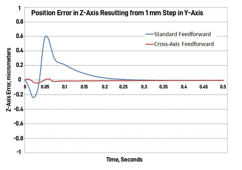 跨軸前饋 (Cross-Axis Feedforward) 能補償機械的耦合效應,當 Y 軸進行 1 mm 步進運動時,標準前饋(藍線)會在 Z 軸引發明顯誤差;啟用跨軸前饋(紅線)後,此離軸誤差幾乎被完全抑制,可確保多軸運動的軌跡精度。