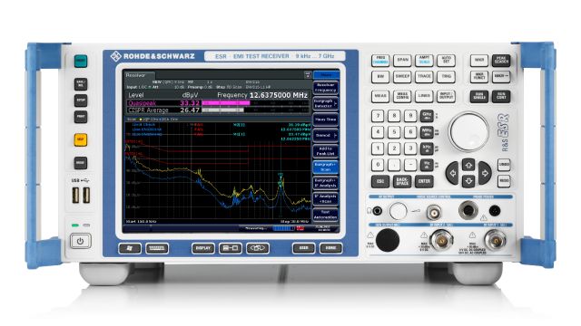 R&S ESR 是一款專為 10 Hz 至 26.5 GHz 頻率範圍設計的 EMI 測試接收器,完全符合 CISPR 16-1-1 標準,這款接收器不僅支援傳統的步進式頻率掃描,更具備快速 FFT時域掃描功能,能以極快的速度量測電磁干擾;R&S ESR 結合了即時頻譜分析與多種診斷工具,讓工程師能對干擾訊號進行深入分析,憑藉其清晰的選單結構與直覺的觸控螢幕,無論在哪種模式下操作都輕鬆自如。