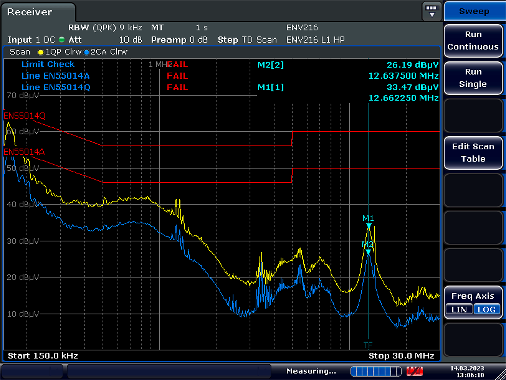 R&S ESR 支援符合 CISPR 14-1 和 EN 55014-1 標準的量測,溫控或程式控制的電器(如洗衣機和空調)會產生非連續性的干擾,由於不連續干擾訊號 (Click) 干擾的非週期性特質,其需遵守的限制值不像連續干擾那樣低,為了應用這些較寬鬆的限制值,使用者需要量測喀嚦聲的持續時間、重複率(不連續訊號)和振幅。