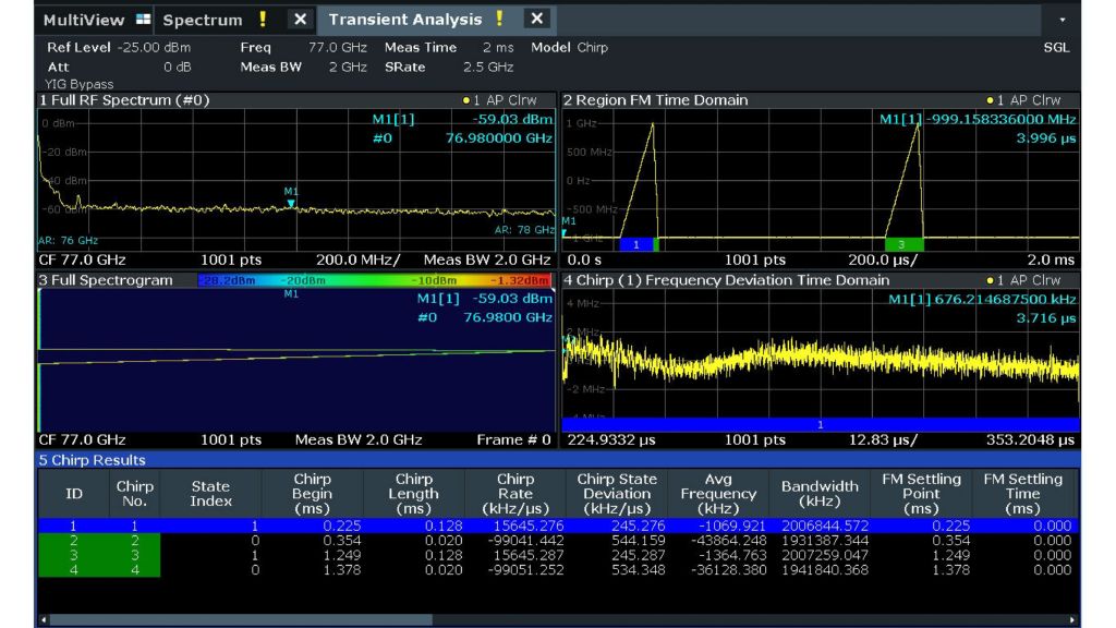 汽車雷達量測: R&S®FSW 配置 K60C 選項和 B2001(2 GHz 內部頻寬擴展),量測 77 GHz 載波上的頻寬為 2 GHz 的 FMCW 訊號。