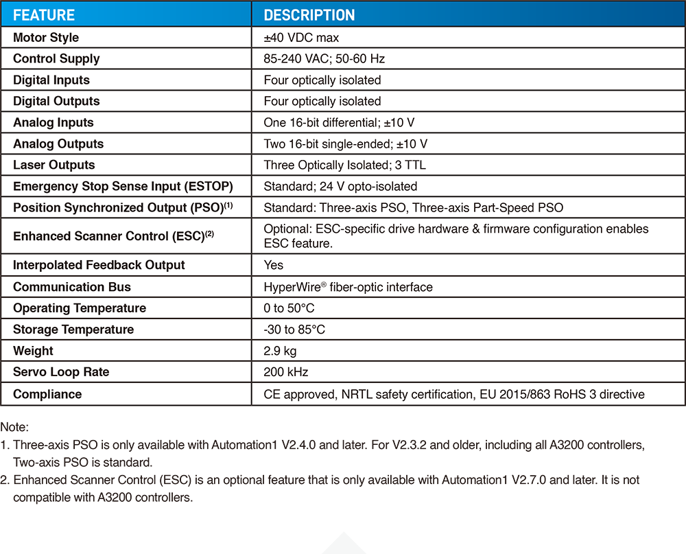 搭載 Automation1 控制平台,此款 GL4 不僅是一個掃描頭驅動器,更是一個功能齊全、以電腦為運算核心的即時自動化控制器,最多可控制 32 個伺服軸或 5 組掃描器,它能夠協調多達 64 個同時運作的平行任務,並透過 AeroScript™ 編程語言控制整套機台,或者,使用者也可利用 .NET、C 和 Python 的 API 來開發自訂的人機介面 (HMI),其低延遲的 HyperWire 網路架構讓所有軸都能執行低延遲運動,從而實現複雜的運動學應用,例如:整合雷射掃描頭與伺服軸的五軸輪廓加工,此為市場上其他掃描器控制方案所無法企及的整合能力。