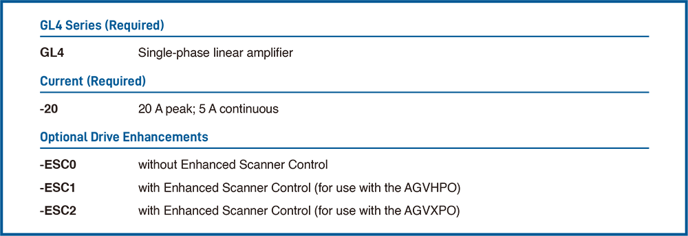 GL4 雙軸線性伺服驅動器是專為搭配下列 AGV 掃描頭而設計,您可以使用它來驅動單一的二維掃描器,也能與 Automation1 XL4 線性單相伺服驅動器協同運作,用以控制 AGV 三維及五維掃描頭,所有裝置皆透過 HyperWire 通訊匯流排連接。