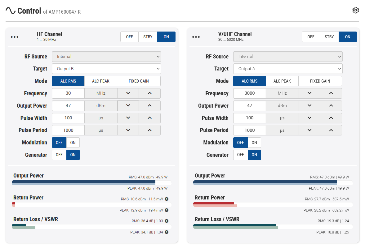 系統會持續監控兩個輸出埠的正向與反向功率,使用者也可選擇切換顯示為駐波比(VSWR);反射功率的量測同時具備保護放大器免於過度阻抗不匹配的功能。
