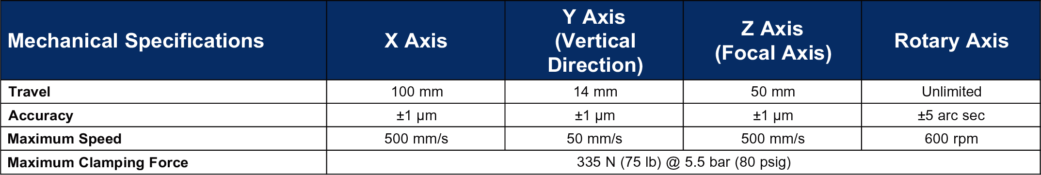 X/Z 長行程可支援最大 100 x 100 mm 工件,並適用 50-400 mm 的焦距範圍,滿足多樣化應用需求。