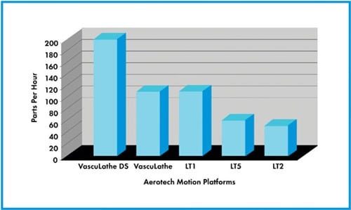 此圖展示了各種 Aerotech 運動平台每小時的生產零件數量;VascuLathe DS 以 200 件/小時的產能居冠,顯示出卓越的生產效率;其次為 VascuLathe 和 LT1,產能約為 120 件/小時;LT5 和 LT2 的產能相對較低,分別約為 80 件/小時與 60 件/小時。
