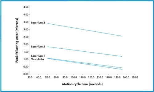 此圖展示了隨著運動週期時間增加,各型號設備的峰值跟隨誤差(以微米計)變化情況;LaserTurn 1 和 VascuLathe 擁有最低的誤差值,顯示出更高的精度表現;LaserTurn 5 和 LaserTurn 2 的誤差較高,隨著週期時間增加,誤差逐漸下降;這表明在較長的運動週期下,各設備的精度皆有顯著改善。