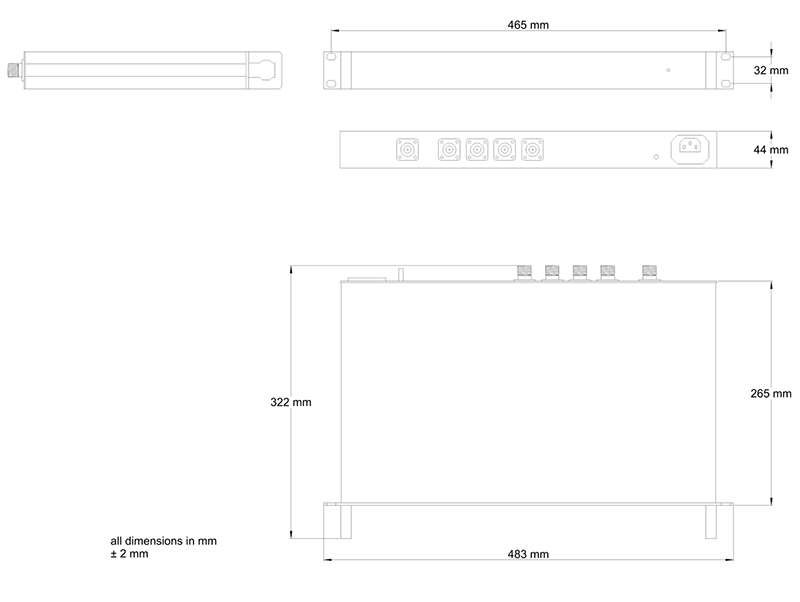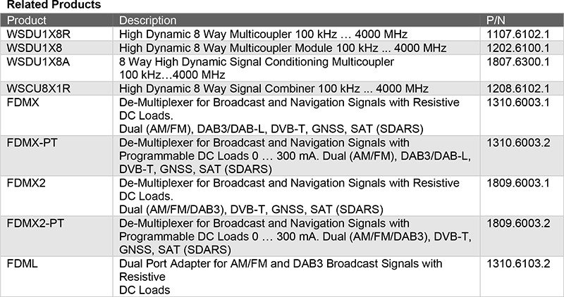 各輸入通道均內建 頻率預選濾波器(Frequency Preselection Filters),用以抑制不必要的雜散訊號;FM、DAB 與 DVB-T 通道更配置 低雜訊、低失真前置放大器,有效補償外部纜線損耗;GNSS 通道支援 虛擬供電(Phantom Power),可供應主動天線電流最高達 200 mA;AM 通道則內建 突波保護器(Surge Arrestor),提供避雷保護。