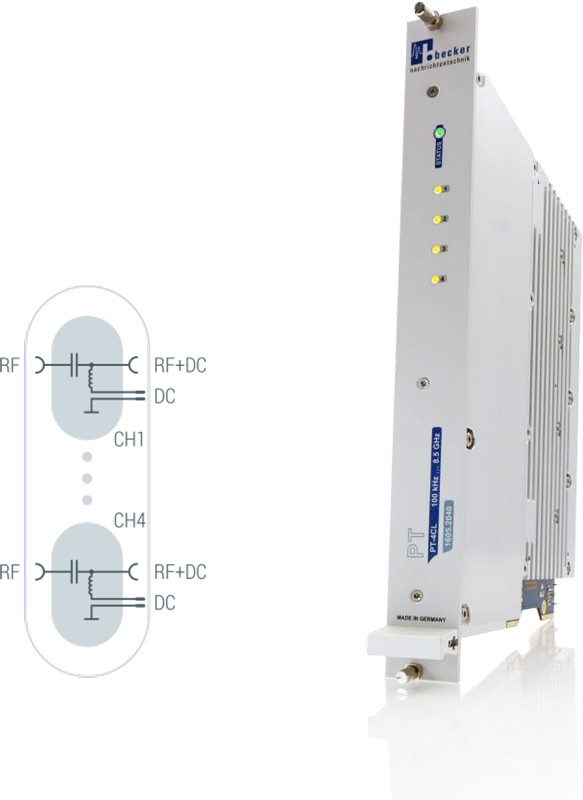 PT-4CL 為專為資訊娛樂元件虛擬電源(Phantom Supply)測試所設計之 高頻寬直流負載模組,具備插槽式模組(Slot-in Module)架構,可無縫整合至 SR6-11C 系統平台中,支援與其他射頻模組平行應用,建構彈性化測試架構;此模組提供 四個獨立射頻通道,每一通道皆內建 超寬頻 BIAS-T(超寬頻偏壓注入器),具備 直流負載電流高達 400 mA 的處理能力,適用於高耗電特性元件之驗證需求。前面板設有 LED 光學指示燈,可即時顯示各通道是否具備虛擬電壓,提升操作便利性與測試安全性;此模組結構堅固、設計緊湊,特別適用於實驗室研發、產線驗證與多模組量測系統環境。