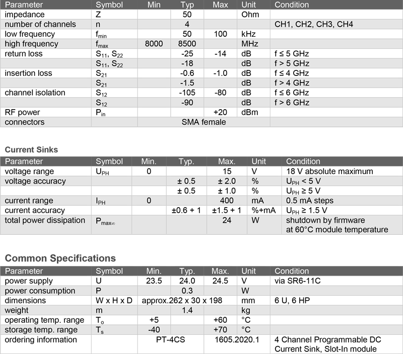 PT-4CS 可程式化直流負載模組為一款 4 通道插槽式模組,設計用於模擬主動式天線在不同載波環境下的電流負載需求;支援 100 kHz 至 8500 MHz 的廣泛頻率範圍,涵蓋 AM/FM 廣播、DAB、DVB-T、GNSS 及行動通訊等常見標準。每一通道可單獨設定直流電流負載,調整範圍為 0~400 mA,步進精度達 0.5 mA,滿足高解析度測試需求;另搭載內建電壓表,可同步量測每一路虛擬(phantom)電源供電電壓,有助於驗證系統穩定性與電源一致性。