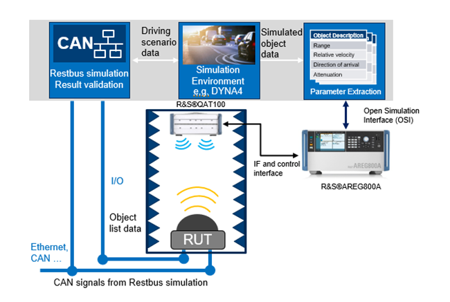 R&S QAT100 與 AREG800A 的硬體迴路 (HIL) 測試架構,透過 OSI 介面與場景模擬軟體無縫整合,實現閉迴路雷達驗證。