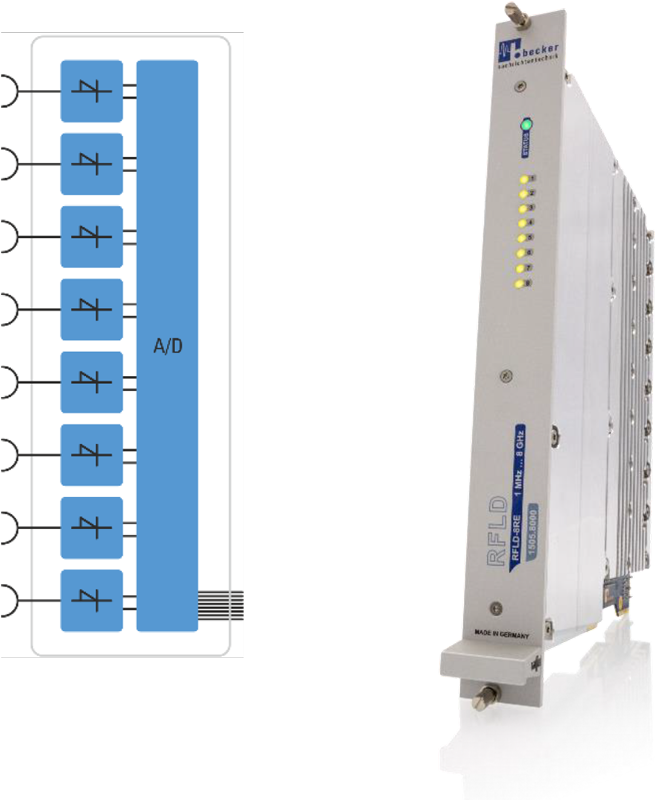 RFLD-8RE 是一款支援高射頻功率量測的 八通道實效功率 RMS 射頻電平偵測單元(True Power RMS RF Level Detector),採用標準 50 Ohm 技術架構,具備廣頻支援與高動態範圍等特性;每個通道的典型偵測範圍為 0 dBm 至 +36 dBm(對應 1 mW 至 4 W),可涵蓋 1 MHz 至 8 GHz 的完整射頻頻率範圍,其中 20 MHz 至 2700 MHz 頻段為 Becker 完整規格定義範圍。