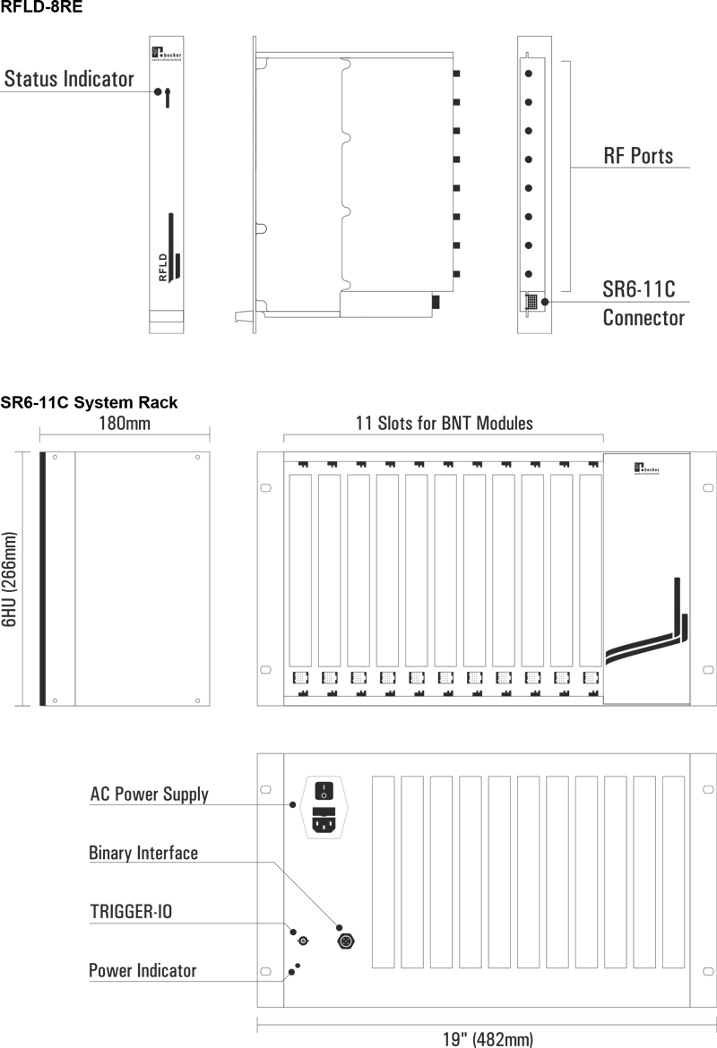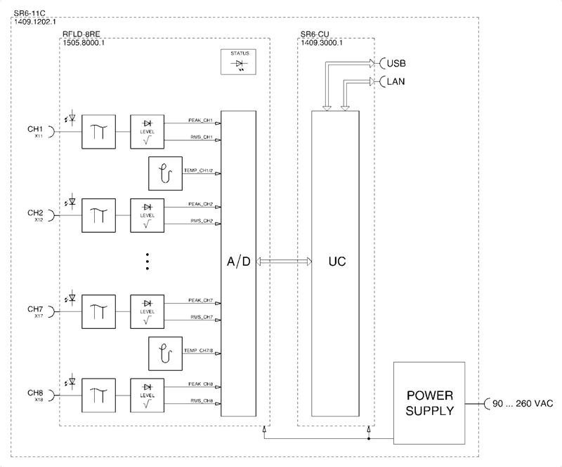 RFLD-8RE 採用小型化模組設計,可將 最多 10 組模組與 1 組 SR6-CU 控制器整合於單一 SR6-11C 系統平台中;針對每通道進行 4 W 高功率量測應用時,需搭配 FU-320 風扇單元以確保穩定散熱;整體配置可在僅 8U 機架空間內實現 最多 80 通道的全功率射頻量測能力,兼具彈性與可靠性。