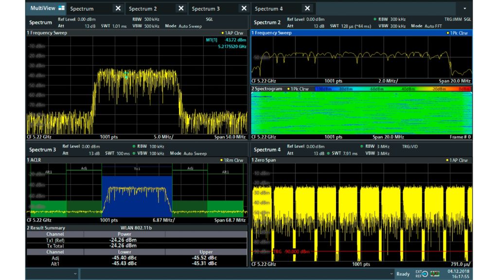FPL 帶有 MultiView 的螢幕截圖,序列器連續執行頻譜量測、鄰道功率量測、時域量測 (Zero span) 和頻譜圖量測,結果清晰地同時顯示,左側的工具列可快速存取最常用的選單功能,頂部的分頁可用於啟用不同的量測。