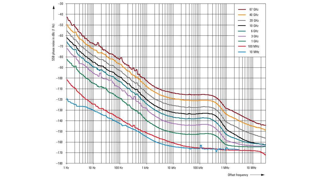 8 kHz 至 3 / 6 / 12.75 / 20 / 31.8 / 40 / 50 和 67 GHz (頻率可延伸至72 GHz),使用 R&S SZM 頻率倍頻器則可將頻率擴展至 50 GHz 到 170 GHz。 - SSB 相位雜訊: