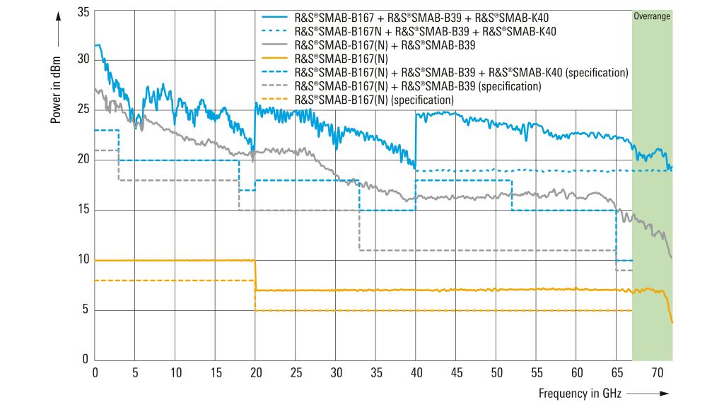 - 67 GHz 機型在 40 GHz 到 65 GHz 之間超過 22 dBm。