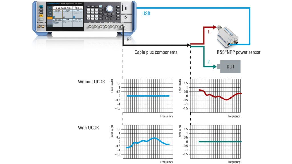測試配置中包括電纜、功率放大器和濾波器始終存在頻率響應,訊號產生器可以補償此頻率響應,R&S SMA100B 專為此目的提供了使用者校正 (User Correction, UCOR) 功能,對於已知需要校正的頻率響應,使用者可以輸入作為頻率函數的電平校正值,儀器會自動在這些頻率點之間進行插值 (Interpolation) 校正,為了簡化此過程,R&S SMA100B 還可以透過直接連接的 R&S NRP18P 功率感測器,一鍵自動納入電平校正值。