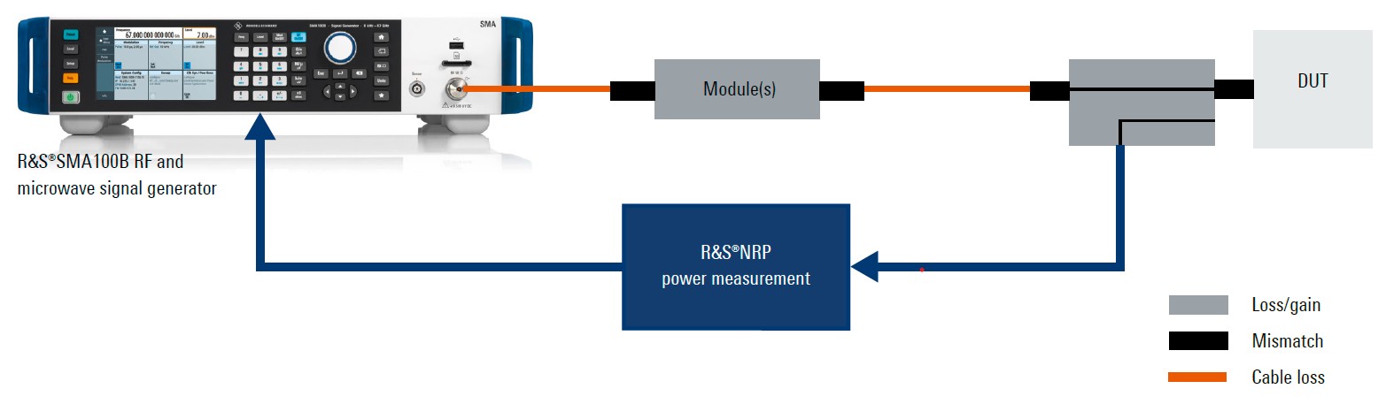 為了量測 DUT 輸入功率,可以使用一個定向耦合器加上連接到該定向耦合器的 R&S NRP 功率感測器;另一種具吸引力的替代方案是 R&S NRP-Z28 電平控制感測器,R&S NRP 功率感測器或 R&S NRP-Z28 的量測結果會回饋給 R&S SMA100B,儀器會立即調整其輸出功率,以補償目標電平與實測電平之間的差異。