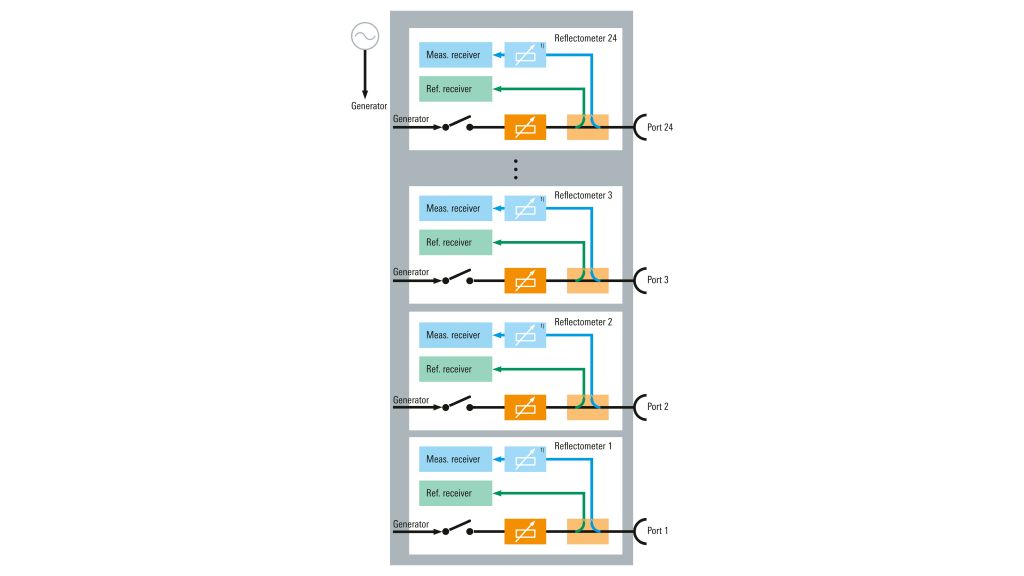 R&S ZNBT 作為真正的多埠向量網路分析儀(True Multiport VNA),其設計核心在於每個測試埠均配備一個獨立的反射計 (Reflectometer),這種完全整合的獨特架構徹底消除了傳統依賴開關矩陣(Switch Matrix)的多埠系統中,訊號路徑因開關和纜線引入的額外損耗與串擾;因此,R&S ZNBT 能夠提供業界領先的射頻性能: