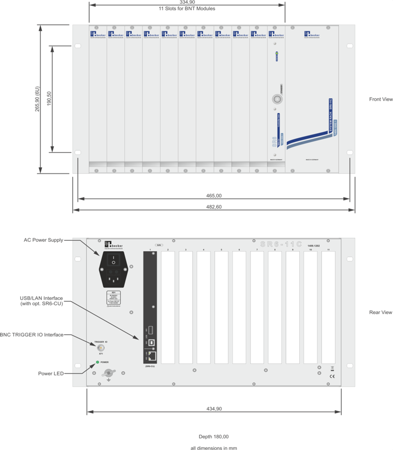 RSWM-4X4 模組設計可整合至 SR6-11C 系統平台,SR6-11C 擁有 11 個模組插槽,可彈性配置如射頻開關、切換矩陣、多路耦合器、衰減器、BIAS-T、電平偵測器、雙向分配器/合波器等射頻訊號調理模組,並可搭配控制單元組成完整的可程式化測試架構。