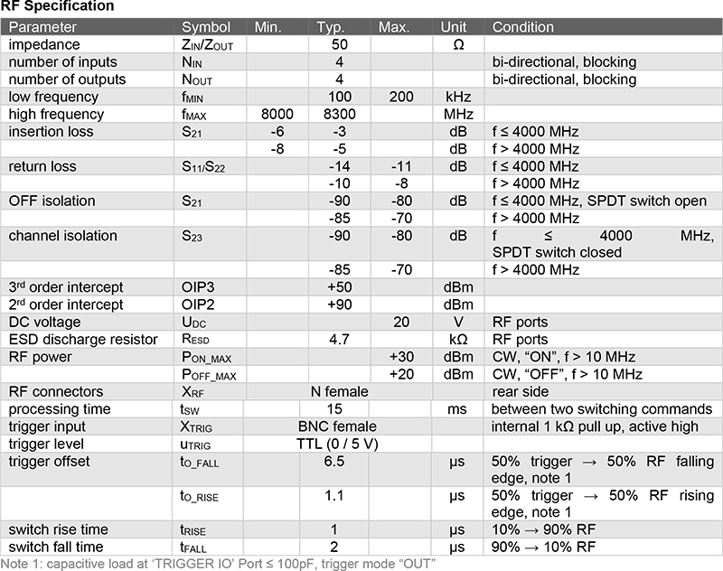 此模組特別適用於建構高密度通訊測試平台,可將多台無線通訊測試儀高效對接至多個 待測物(DUT),或整合多組收發器(Transceivers) 與多天線系統進行靈活模擬;其架構內建八條平行的雙向訊號通道,支援每一輸出埠快速切換對應輸入埠,確保實驗場景中訊號穩定流通與即時切換需求。