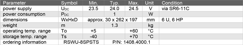 RSWU-8SPSTS 為專為 SR6-11C 系統平台設計之滑入式模組,SR6-11C 系統共具備 11 組插槽,可容納射頻開關、矩陣、分波器、衰減器、BIAS-T、電平偵測器、雙向分波器/合路器等各類射頻訊號處理模組及控制單元。