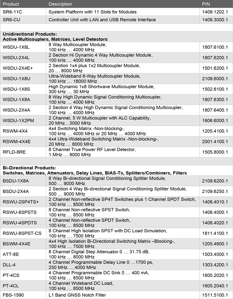 此模組採滑入式機構設計,便於快速安裝於 SR6-11C 系統平台中,實現模組化配置與彈性擴充;搭配 SR6-CU 控制模組使用時,使用者可透過簡潔的 ASCII 控制字串快速完成開關控制,支援遠端與同步操作,特別適合整合於自動化量測系統或大型射頻架構環境。
