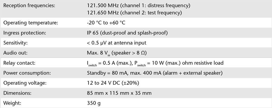 RT-100 國際緊急訊號接收器(Emergency Receiver)可持續監聽全球通用的國際緊急頻率 121.500 MHz,只要接收到來自此頻率的訊號,裝置即會立即觸發聲響警報,並透過內部繼電器,同步啟動外部警報系統或裝置。
