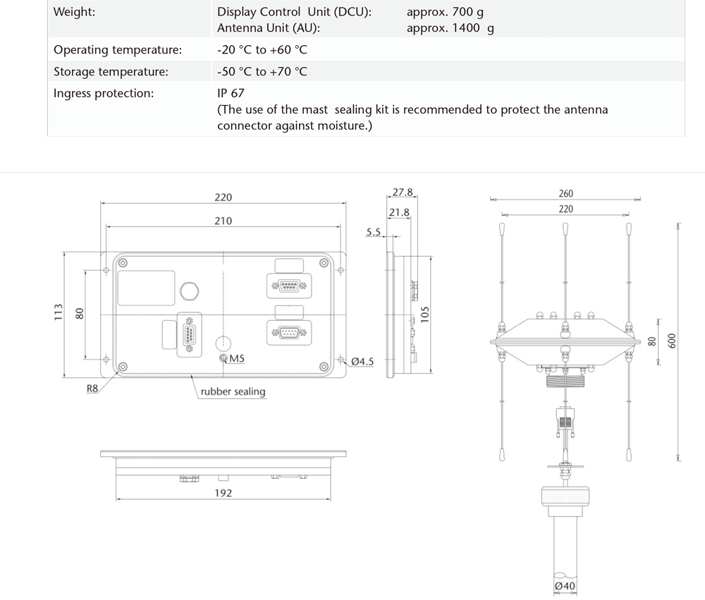 - NMEA、RS-485 和 RS-232 介面,支援 系統整合與遠端控制