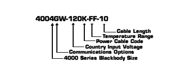 SBIR 4000 系列黑體系統提供六種可選配分類;這些特色包括黑體尺寸、通訊選項、國家輸入電壓、電源線代碼、溫度範圍以及纜線長度;舉例來說,一個 4 吋型號 4000 系列系統,配備選項 G 介面與 W 介面,使用 115/60Hz 電壓與美國電源線,溫度範圍為 50°C 至 600°C,纜線長度為 10 英呎,其零件編號如下:4004GW-120K-FF-10