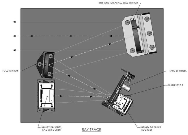 此圖說明 SBIR 紅外目標投影系統的運作原理,系統採用兩個 Infinity DB 系列黑體分別作為目標源與背景源,透過折疊鏡與離軸拋物面鏡將紅外輻射準直並導向目標輪與照明器,最終形成精確的紅外測試場景,用於評估感測器性能。
