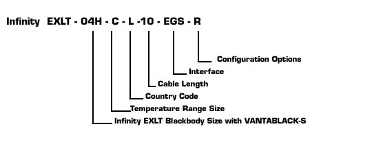 SBIR 的產品型號由六個欄位組成,代表客戶可選擇的不同配置,包括:黑體型號、黑體尺寸、溫度範圍、輸入電壓/電源線類型、線材長度、通訊介面及其他配置選項。