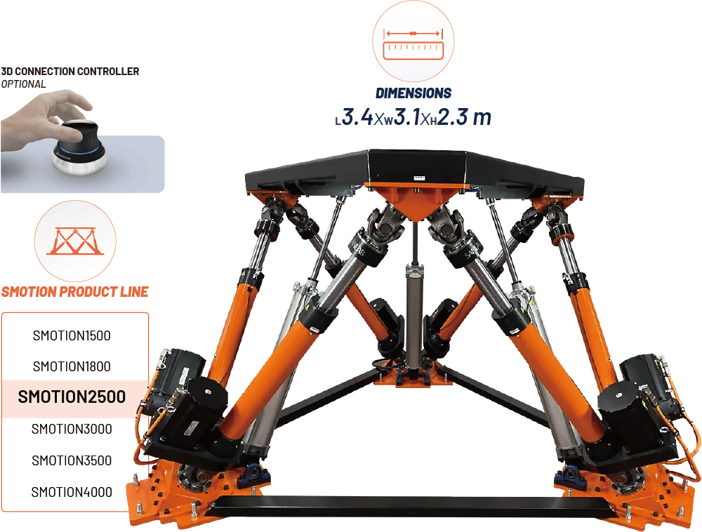 SMotion2500 是一款最先進的 6DOF 運動平台,專為各種高科技應用提供精確的運動控制,其有效負載能力高達 2500 公斤,使其成為多個產業的多功能解決方案。