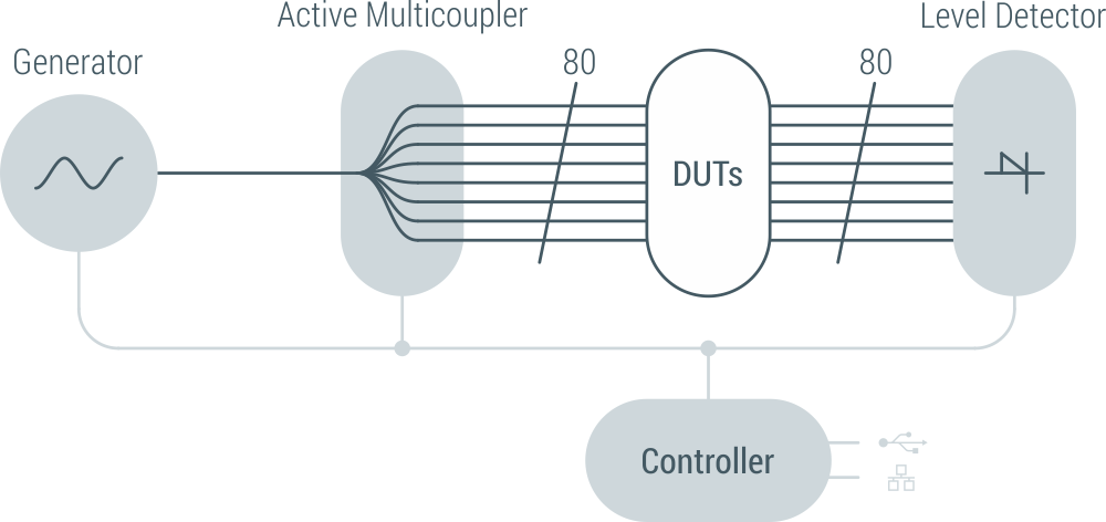 執行 HTOL 測試與電源壓力測試時,需搭配具備多通道輸出能力的 RF 系統,並確保每個通道能長時間穩定地輸出高精度功率;TSQA-1X80PM是一款專為此應用設計的小型化、自動化 HTOL RF 量測系統,支援20 MHz 至 3000 MHz 頻段,採用50 歐姆架構;系統內建80 個獨立 RF 通道,每通道可提供最高3 瓦輸出功率,實際可達 DUT 輸入端的功率為2.5 瓦,可完全滿足嚴格的 HTOL 測試需求。