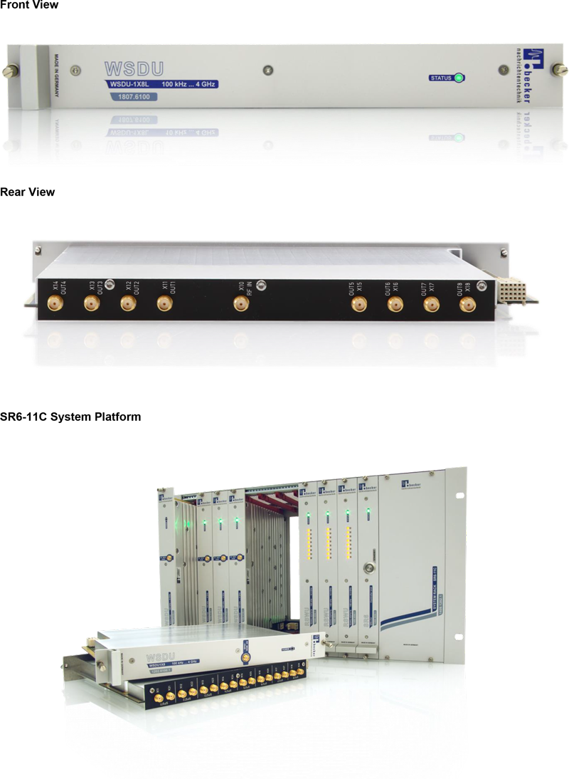 WSDU-1X8L 模組專為整合至 SR6-11C 系統平台而設計;SR6-11C 提供多達 11 組模組插槽,可用於配置各類射頻模組,例如:射頻開關(RF switches)、訊號矩陣(matrices)、多路耦合器(multicouplers)、衰減器(attenuators)、BIAS-T 模組、電平偵測器(level detectors)、雙向分波/合波器(bi-directional splitters/combiners)等訊號調理模組,並可透過控制器模組進行集中管理;若需進行模組狀態監控,必須搭配使用 SR6-CU 控制器單元。