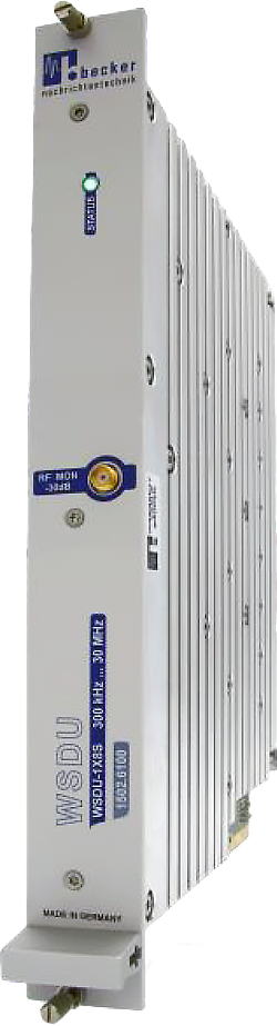 插槽式模組 WSDU-1X8S 為一款寬頻高動態多工耦合器,專為專業短波接收系統設計,具備高線性、高輸出隔離度與抗雜訊干擾能力;其頻率涵蓋範圍廣泛,自 300 kHz 至 30 MHz,支援高靈敏度接收應用;WSDU-1X8S 採用低雜訊、高動態放大器架構,確保輸出訊號在八個埠上等級無損耗分配,並內建頻段通帶濾波器與電路保護機制,大幅提升系統穩定性與可靠性。