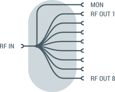 此模組採用低雜訊且高動態的放大器設計,使輸入訊號可在八個輸出埠上以等級無損耗方式輸出,所有射頻埠均使用 SMA 母頭連接器,設置於模組後方。