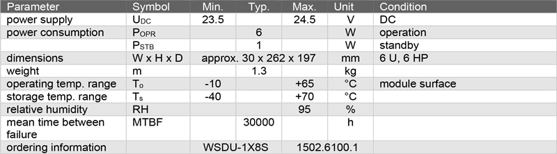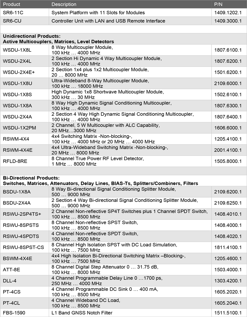 WSDU-1X8S 模組設計用於整合至 SR6-11C 系統平台中,SR6-11C 提供 11 個模組插槽,可容納射頻切換器(RF switches)、矩陣模組(matrices)、多工耦合器(multicouplers)、衰減器(attenuators)、BIAS-T、電平偵測器(level detectors)、雙向分配器/合波器(bi-directional splitters/combiners)等訊號調理模組與控制單元;若需啟用 WSDU-1X8S 的模組狀態監控功能,需搭配 SR6-CU 控制器單元使用。
