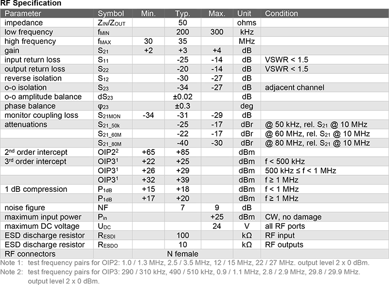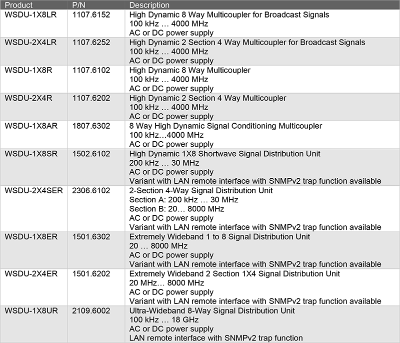 WSDU-1X8SR 為一款寬頻分配器(Multicoupler),可將來自單一共用輸入埠的射頻訊號無損分配至 8 個等效輸出埠,涵蓋頻率範圍為 200 kHz 至 32 MHz,特別針對短波(Shortwave)應用所設計,此機種具備高動態範圍特性,即使在強干擾或惡劣接收環境下,亦能穩定維持優異的訊號處理效能。