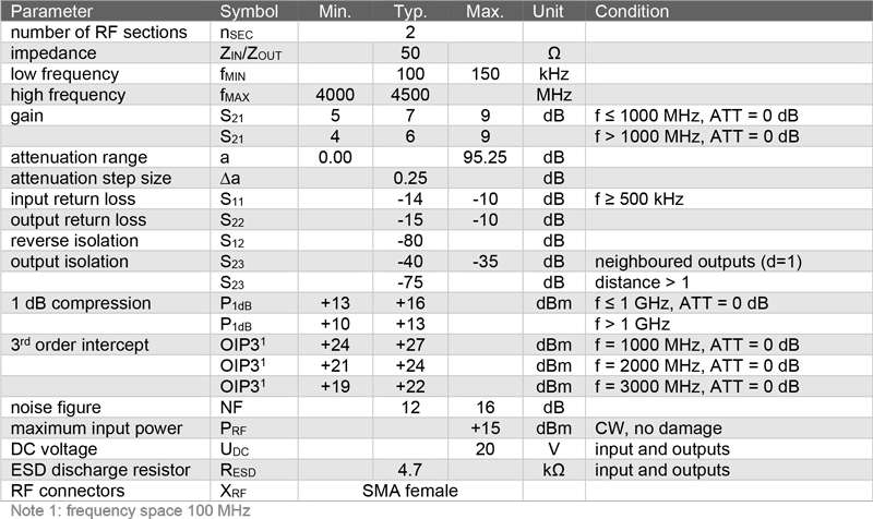 每一個輸出埠皆內建可程式化衰減器,支援最高 95.25 dB 的調整範圍,且每一通道皆可獨立設定,調整步進為 0.25 dB,提供精細電平控制能力。