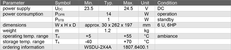 WSDU-2X4A 為一款高動態寬頻訊號分配單元,由兩組獨立主動式多工耦合器(Multicoupler)所構成,每一輸出路徑皆配備可程式化衰減器,因此兩組中各 4 個輸出皆可於寬廣範圍內獨立設定電平;此模組具備高輸出對輸出隔離度,即使變更單一輸出負載,亦不影響其餘通道穩定性,可確保多通道 DUT(待測物)同時進行穩定分配;增益可達 6 dB,衰減控制範圍達 95.25 dB,並具備 0.25 dB 微調解析度,使其特別適用於廣播、導航、研發、量產測試等多樣化應用需求。