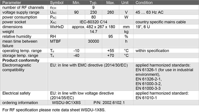 WSDU-1X8S 插槽模組具備針對突波(surges)與頻段外訊號(out-of-band signals)之輸入電路保護功能,該裝置的 RF 輸入端配置有放電元件與過電平保護,後者採用剪波二極體(clipping diodes)實現;額外配置之帶通濾波器可進一步抑制不必要的頻段外訊號。