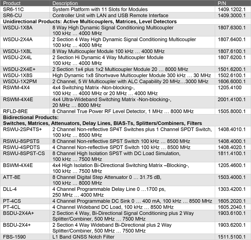 以及一組用於整合至 SR6-11C 系統平台的控制器模組,模組之控制作業經由 SR6-CU 插槽控制器完成,支援以 SCPI 格式之 ASCII 命令字串進行操作,系統將依據安裝之模組自動建立並擴充 ASCII 命令集;所有可用插槽模組列於下方「相關產品」中。